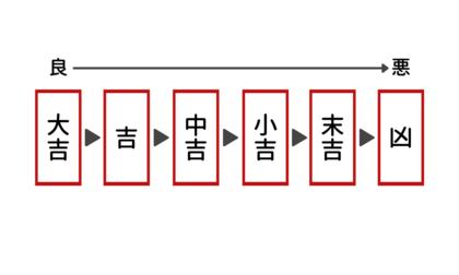 吉凶がハッキリと出るからこそ、それに振り回されてはいませんか?実際の吉凶の順番はこのようになっています。神社庁が発表しているものですから、一般的なものです。ただし神社によっては明治神宮のように吉凶のないものもありますし、伏見稲荷大社ではもっと細かく17種にも分かれているものもあります。